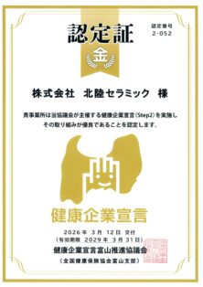 株式会社北陸セラミックは、従業員全員が心身ともに健康でいきいきと働き、その能力を十分に発揮できる職場を目指します。